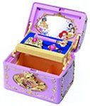 ディズニープリンセスシリーズ「魔法の宝石箱」。中のアクセサリーを取り置きすると、プリンセスのおしゃべりが聞こえてくる、たくさんのアクセサリーが入ったゴージャスな宝石箱。フタを開くと上面に鏡がついており、白雪姫やアリエルなど、ディズニーキャラクターのヒロイン達の絵が描かれている。取っ手もついて持ち運びも便利。